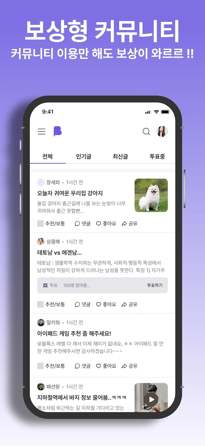 📥 앱 다운로드보상형 익명 커뮤니티앱, 글쓰기·댓글·공감 활동과 데일리 미션으로 포인트를 모으고 교환