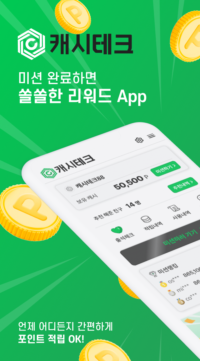 캐시테크는 짧은 퀴즈·검색/확인형 미션을 수행해 포인트를 적립하는 앱테크 앱입니다. 적립 포인트는 1:1 환전을 내세우며, 출금 메뉴에서 계좌로 현금화할 수 있습니다. 후기 기준으로는 5,000원부터 출금 가능하고 출금 수수료 500원이 차감된 금액이 입금된다고 안내됩니다.