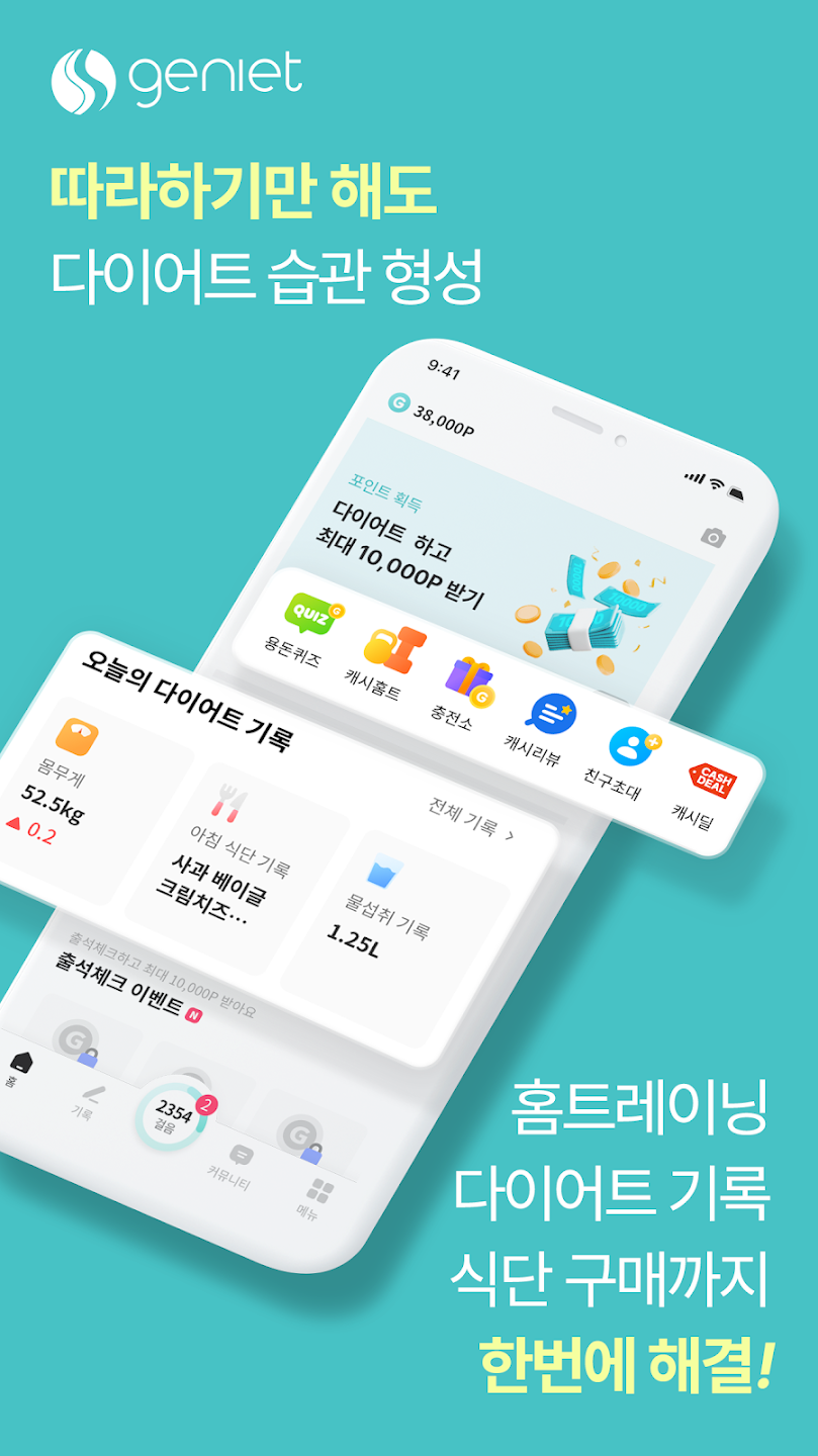 지니어트는 홈트 프로그램 수행, 식단/체중/운동/혈당 기록 등 건강 습관을 남길 때마다 포인트를 적립해 동기부여를 주는 구조입니다. 스토어 설명에는 기록 1회당 포인트 적립, 만보기 기능, 그리고 적립 포인트로 건강 관련 상품을 할인 구매하는 “다이어트 커머스” 기능을 안내해요.