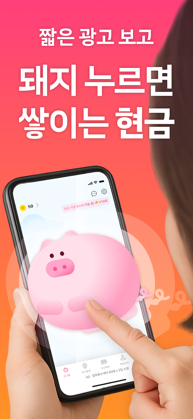 📥 앱 다운로드5~10초 광고 보고 돼지 터치만으로 포인트 모아 현금으로 바꾸는 터치형 앱테크