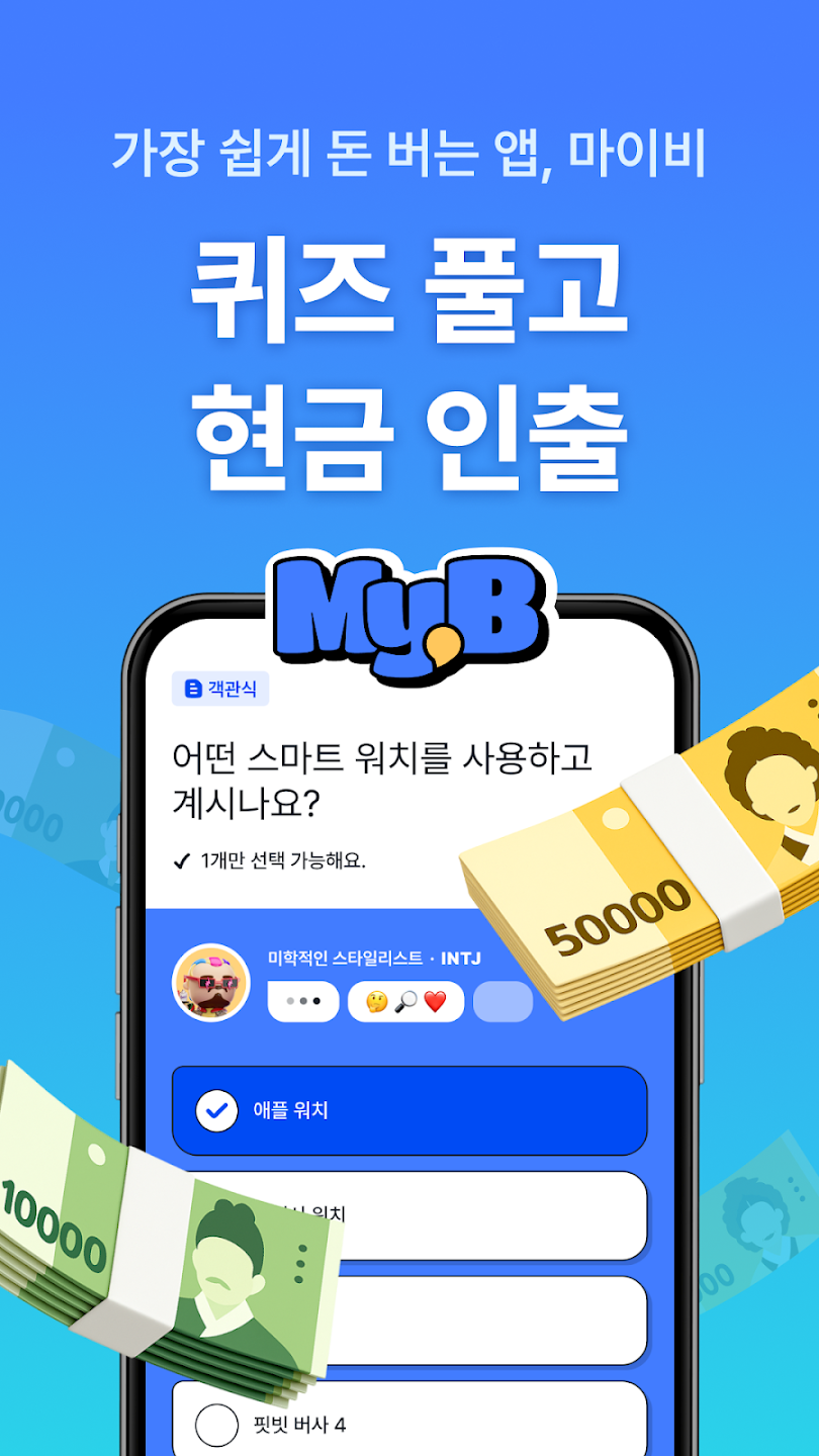 마이비(MyB)는 짧은 퀴즈·취향 설문·게임·쇼핑 연동 미션에 참여해서 포인트(B포인트)를 적립하고, 이를 현금·네이버페이·기프티콘·금·코인 등으로 바꿀 수 있는 퀴즈형 앱테크 앱이에요. 앱 안에서는 ‘꿀’이라는 재화를 광고 시청 등으로 먼저 모은 뒤, 이 꿀을 사용해 설문·퀴즈에 참여하고 B포인트·엑스플라(XPLA) 등 리워드를 받는 구조예요.