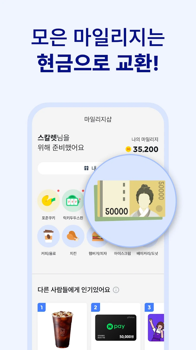 ⑤ 목표 금액(예: 1.5만원권) 도달 시 교환/전환 메뉴로 교환해요(조건은 앱 내 공지 기준으로 확인 권장).